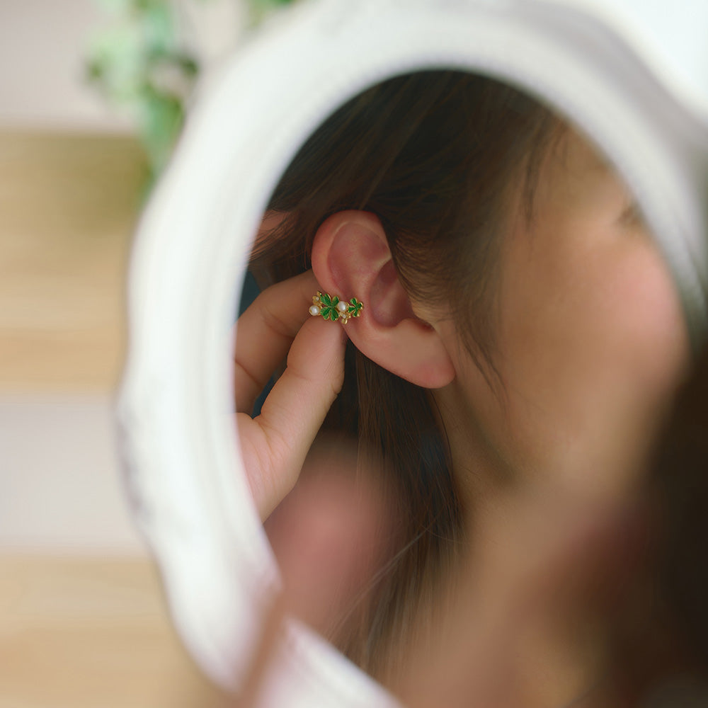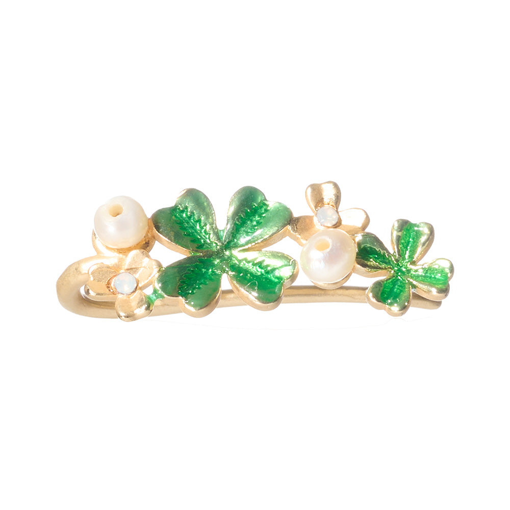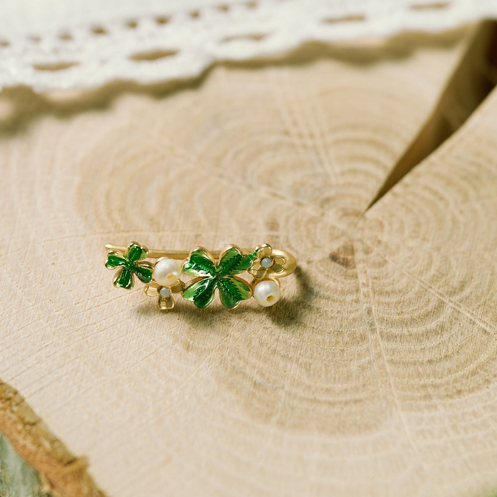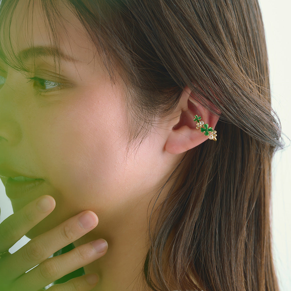 Bless your look with our Lucky Clover Ear Cuff, a piece inspired by the serene sunlit garden. Intricately detailed with iconic clovers accented with freshwater pearls, these delicate, organic accessory is crafted to bring a touch of luck to your everyday style.