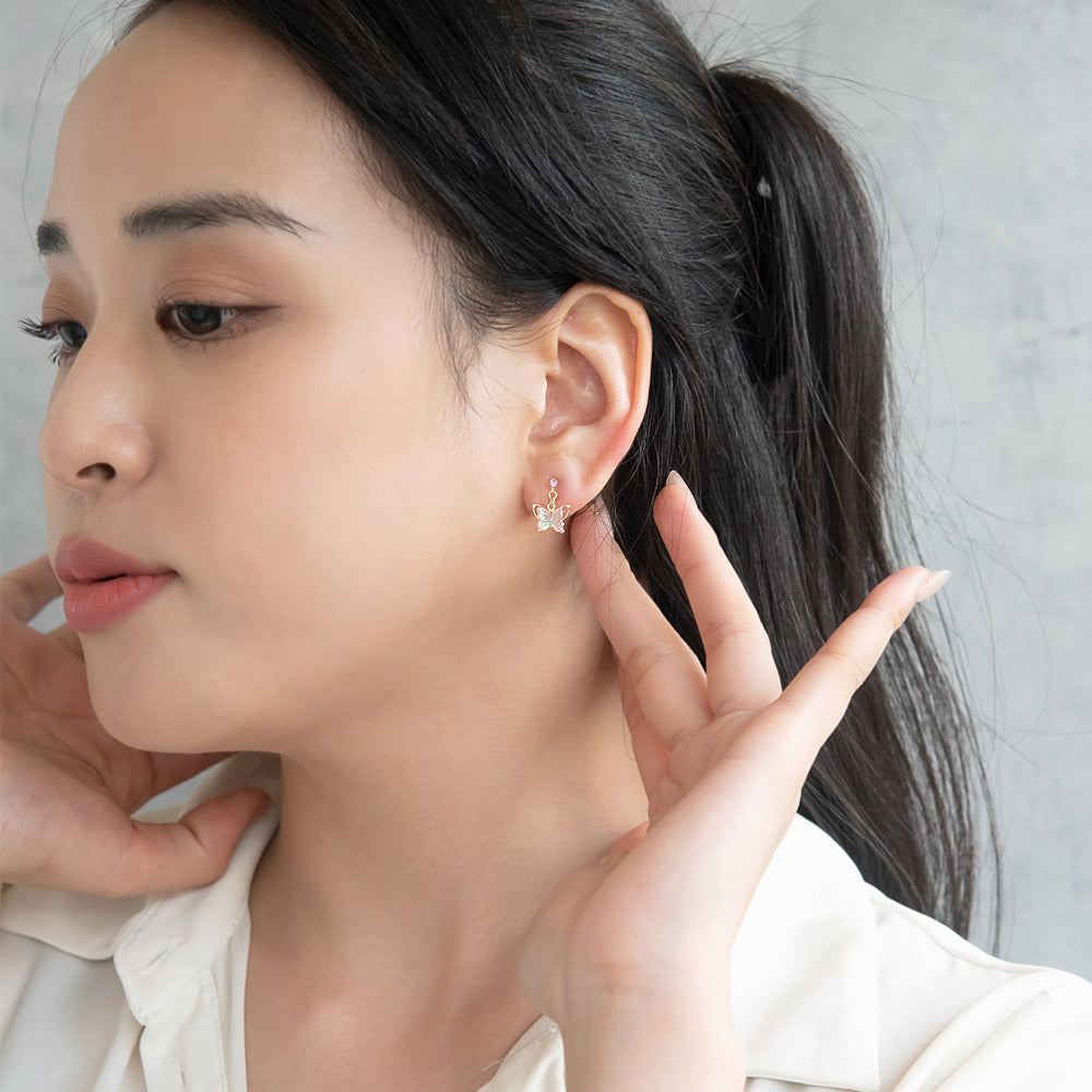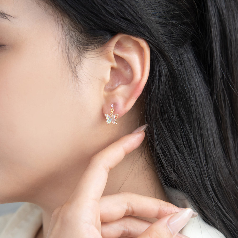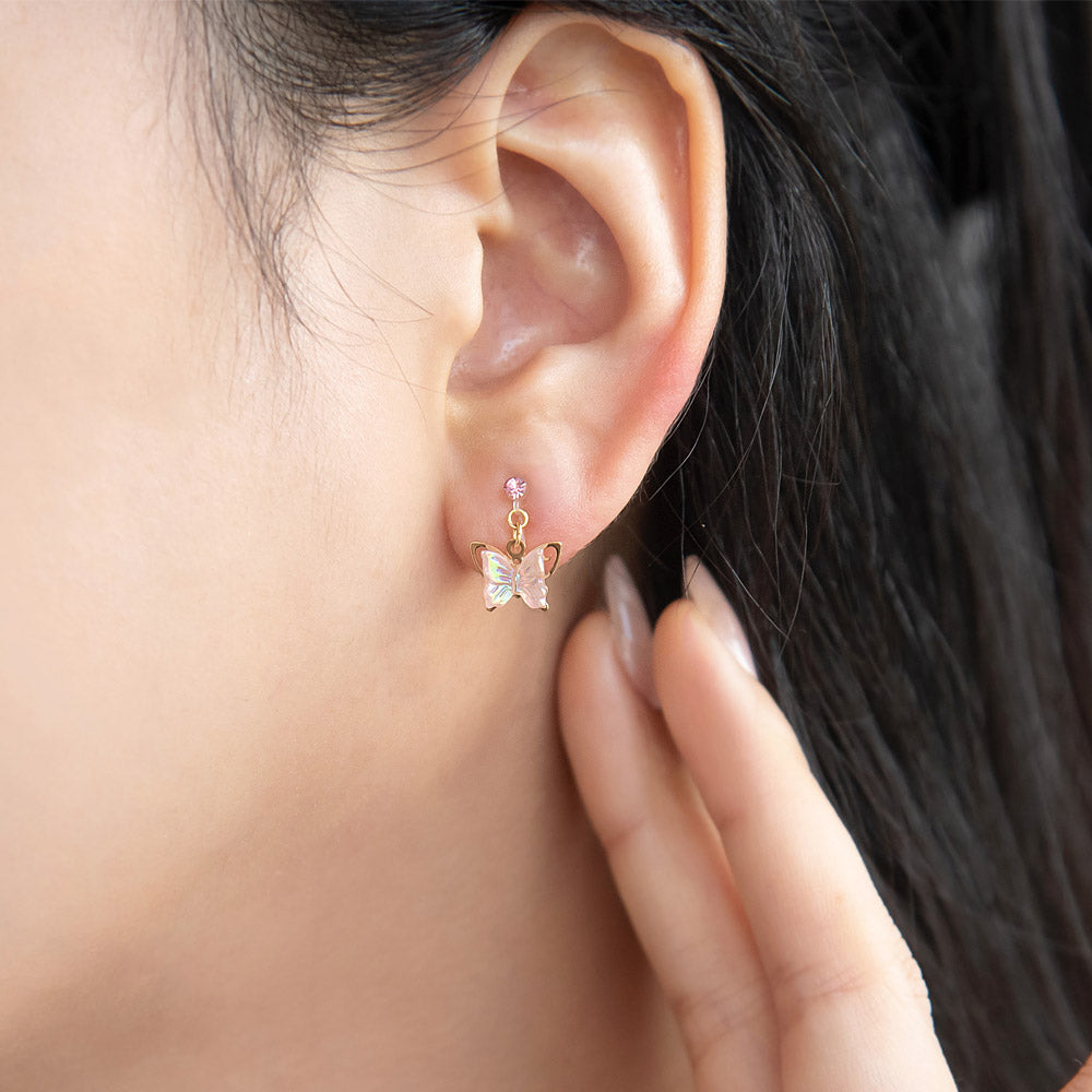 Experience the beauty of our Iridescent Butterfly Drop Invisible Clip Ons. These elegant earrings feature a mesmerizing butterfly pendant that will add a touch of sophistication to any outfit. Crafted with small plastic clip-on backs, they offer exceptional comfort, even for those with sensitive skin.