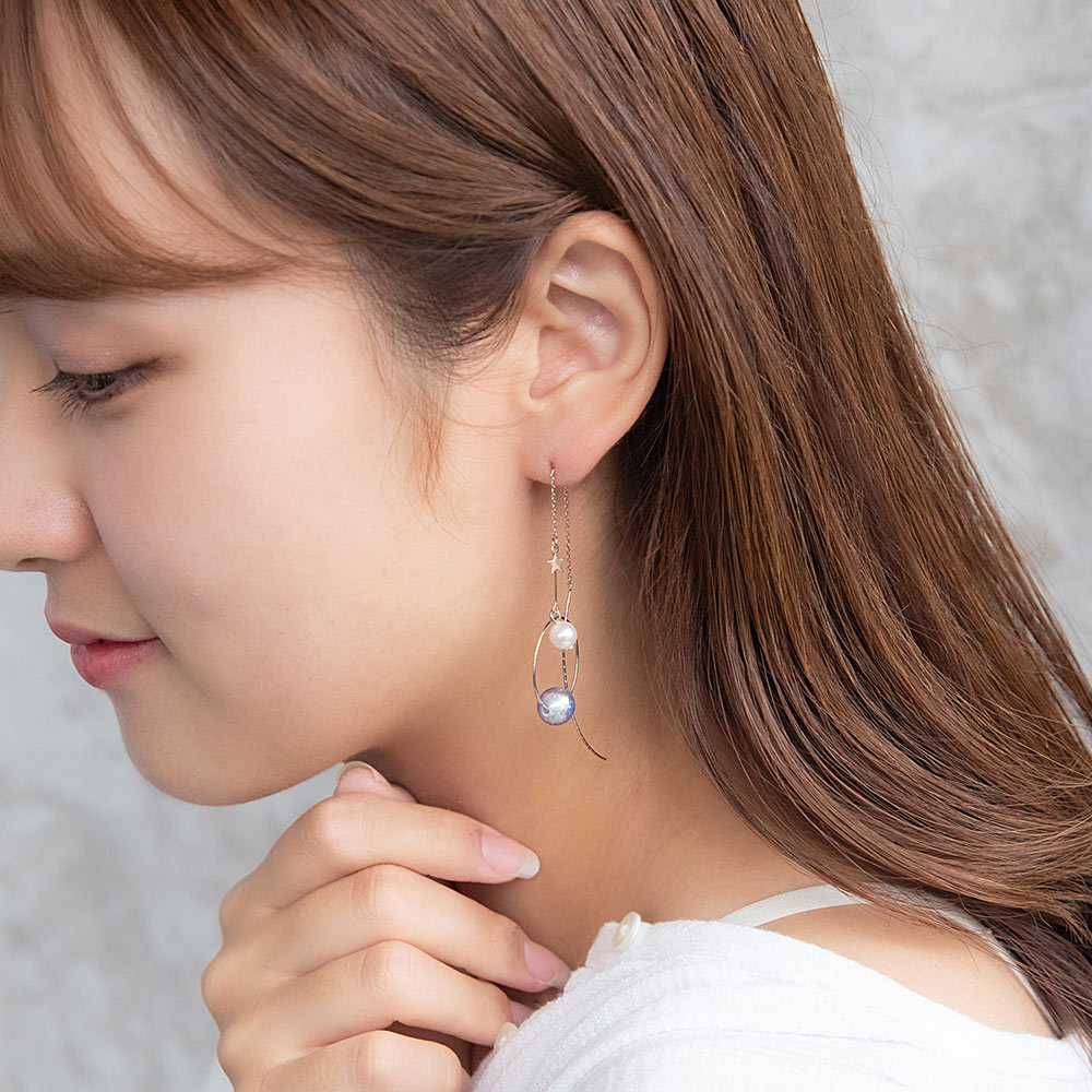 Unveil the magic of the night sky with our Planetary Drop Threader Earrings. Inspired by the wonder of the cosmos, these artful earrings showcase a luminous blue orb and a faux pearl positioned on a delicate hoop—like distant planets tracing their eternal paths. Thoughtfully crafted from nickel-free materials, they’re gentle on sensitive ears and perfect for all-day wear. Whether you're dressing up or keeping it casual, these earrings effortlessly bring romantic charm.