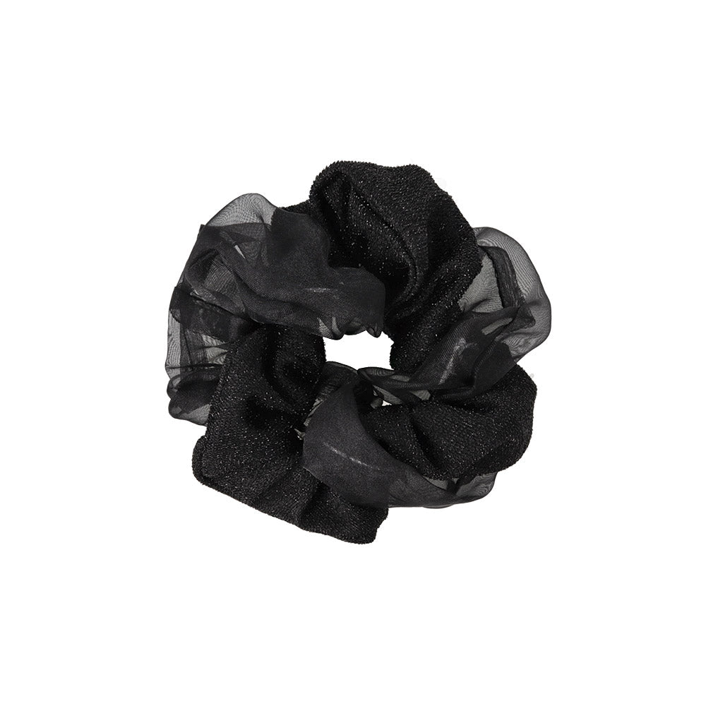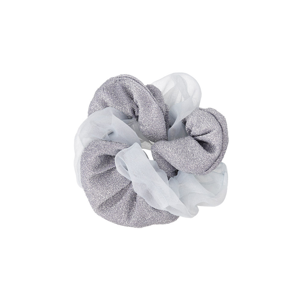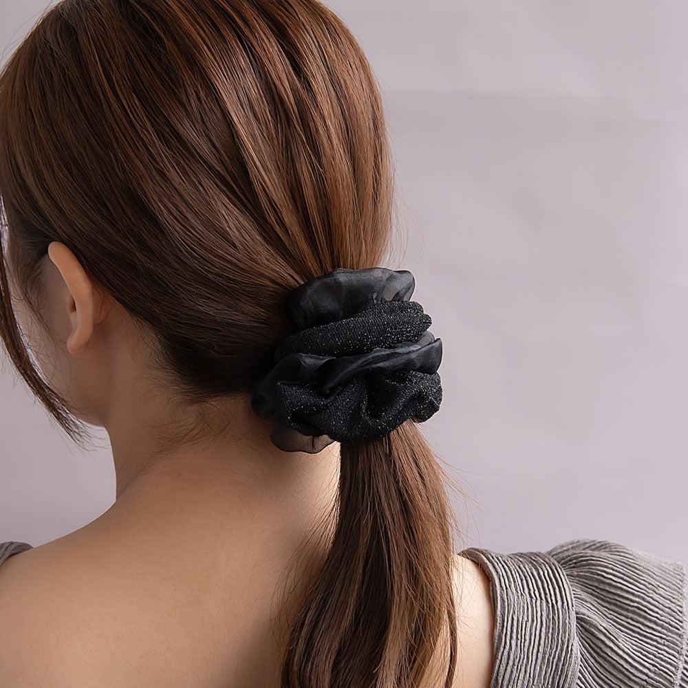 Level up your hair game with our Sheer and Glitter Mix Scrunchie. Featuring a voluminous silhouette with a sheer part and a sparkle part, this scrunchie adds a touch of fun to your everyday style. Perfect for both workdays and weekends, it holds your hair securely without snagging or causing damage.