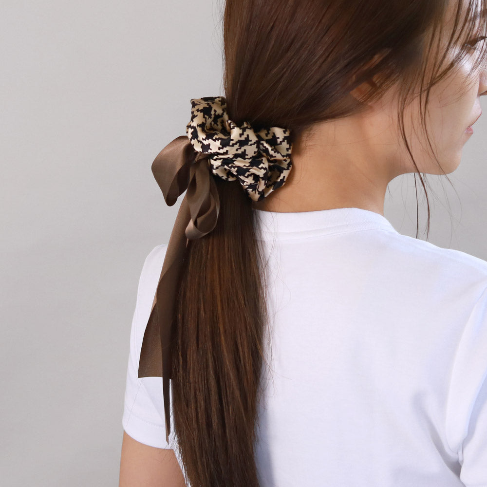 Introducing our Houndstooth Long Tail Silk Scrunchie, a sophisticated and luxurious addition to your hair accessory collection. Crafted with sleek silk material, it keeps your hair stylish without causing any damage. Elevate your look with this exclusive scrunchie.