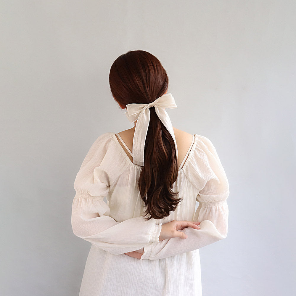 Step into your elegant era with our Metallic Dot Shimmering Bow Hair Tie. Decorated with a shimmering bow accented by metallic dots, this hair tie is perfect for both everyday wear and special occasions.
