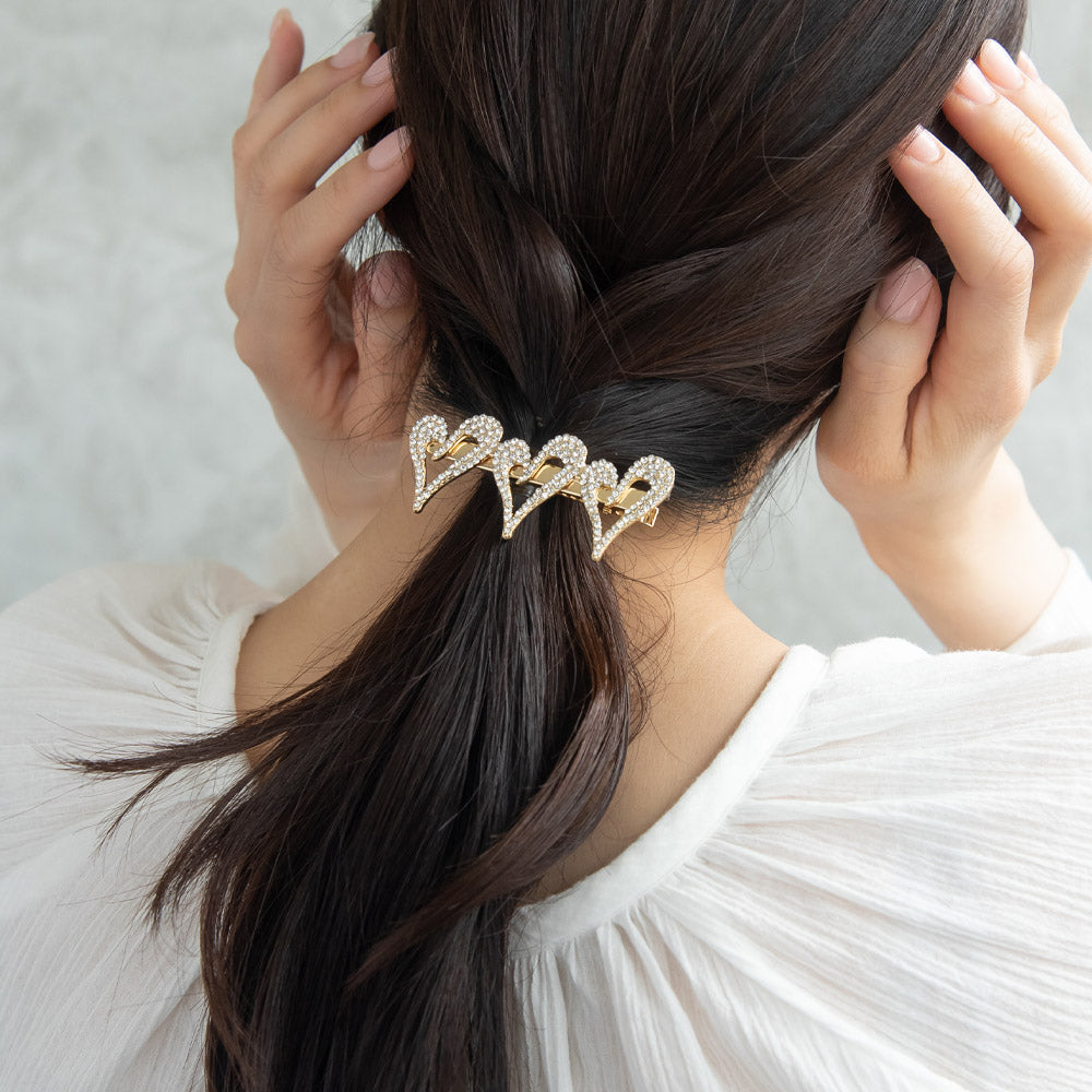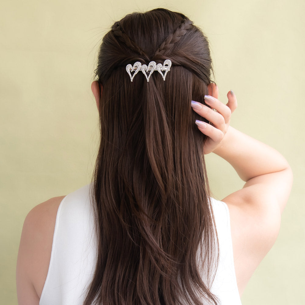 Channel your inner girl with our Triple Pave Heart Pinch Clip. This cute hair clip has a triple heart adornment with pave details, making it the perfect option, whether you're dressing up for a special occasion or simply want to elevate your everyday look. Crafted with nickel free materials, it ensures comfort for sensitive skin.