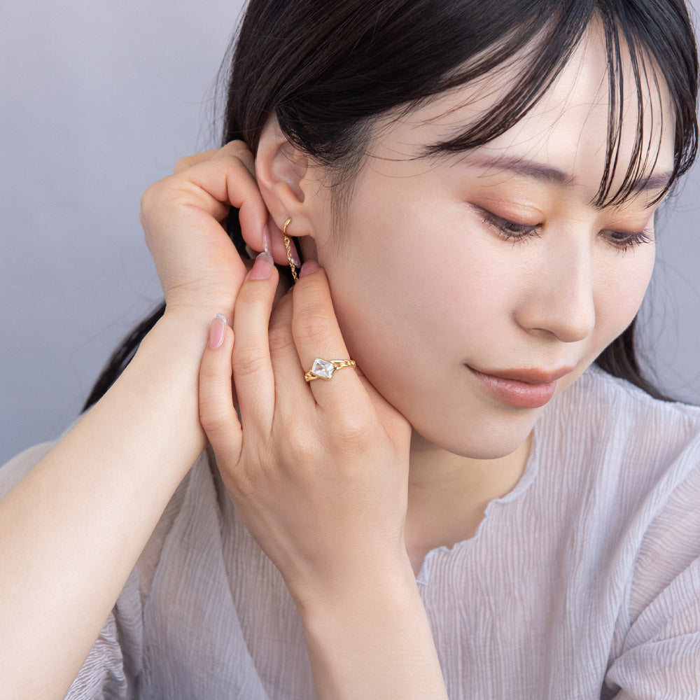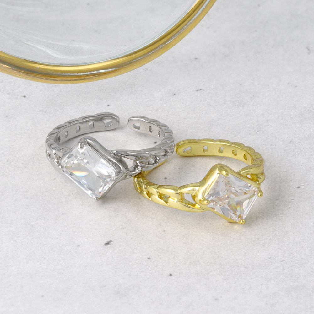 Add a touch of glamor to your ensemble with our Rectangular Stone Open Chain Ring. This elegant ring is beautifully adorned with a rectangle cubic zirconia stone, adding a dazzling finishing touch to your style day or night. Thoughtfully crafted with nickel-free materials, it provides a comfortable fit, perfect even for those with sensitive skin.