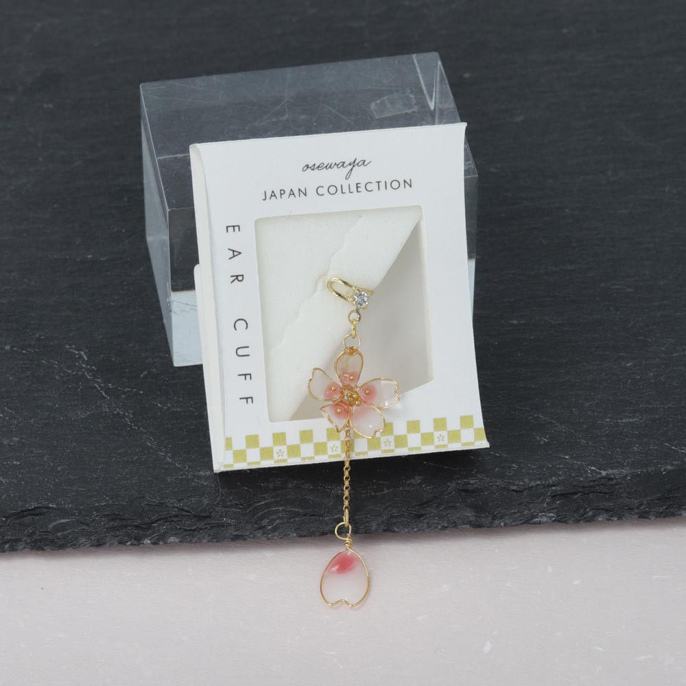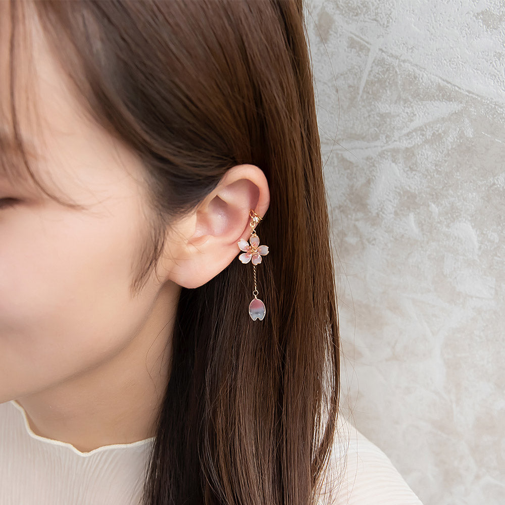 Embrace the essence of Japanese spring with our Sakura Linear Drop Ear Cuff. Featuring a delicate design inspired by cherry blossoms, this ear cuff encapsulates the fleeting beauty of the pink vernal flowers. Perfectly complementing kimono and yukata styles, it also adds a unique twist to modern outfits. Balancing seasonal elegance and traditional beauty, this charming ear cuff will bring a fresh, floral flair to every occasion.