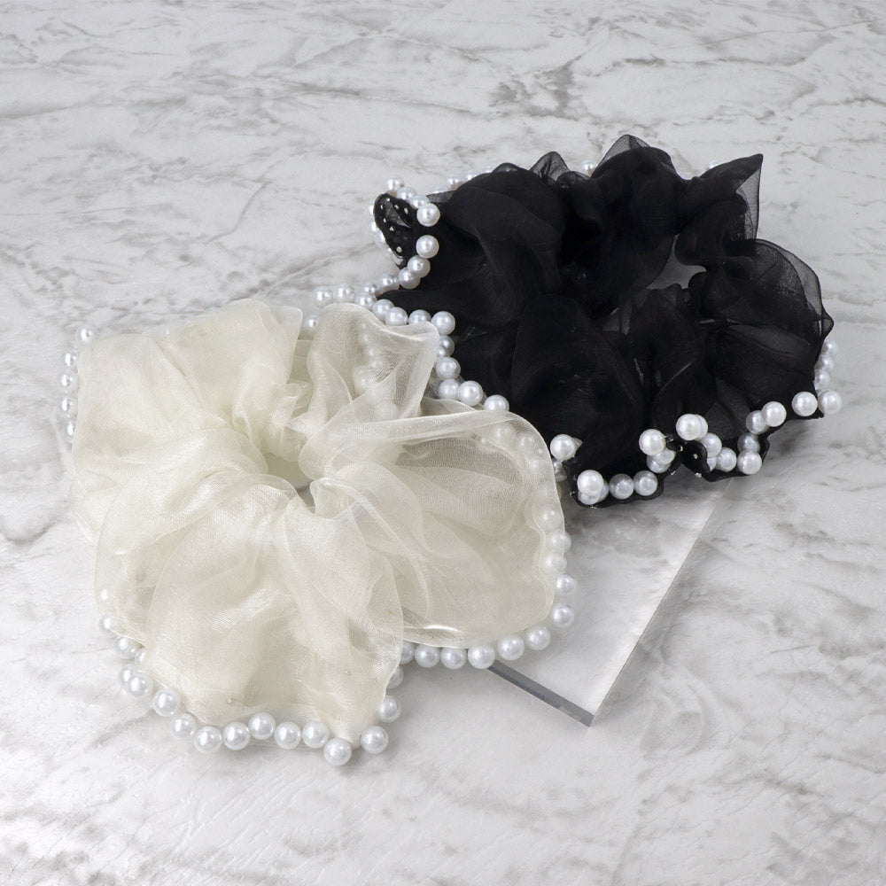 Add a feminine finishing touch to any hair style with our Pearl Rimmed Hair Scrunchie. This hair scrunchie has a gorgeous trim decorated with faux pearls, accessorizing ponytails, buns and even your wrist as a bracelet.