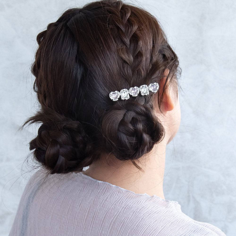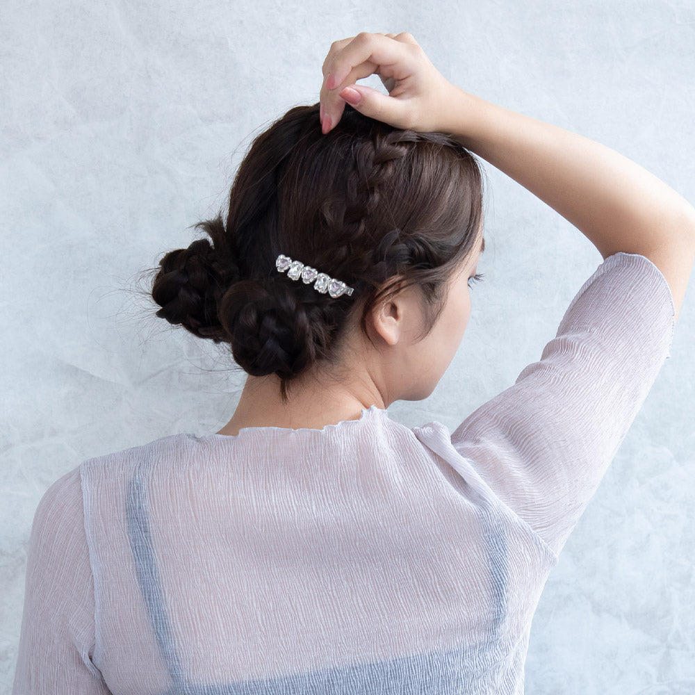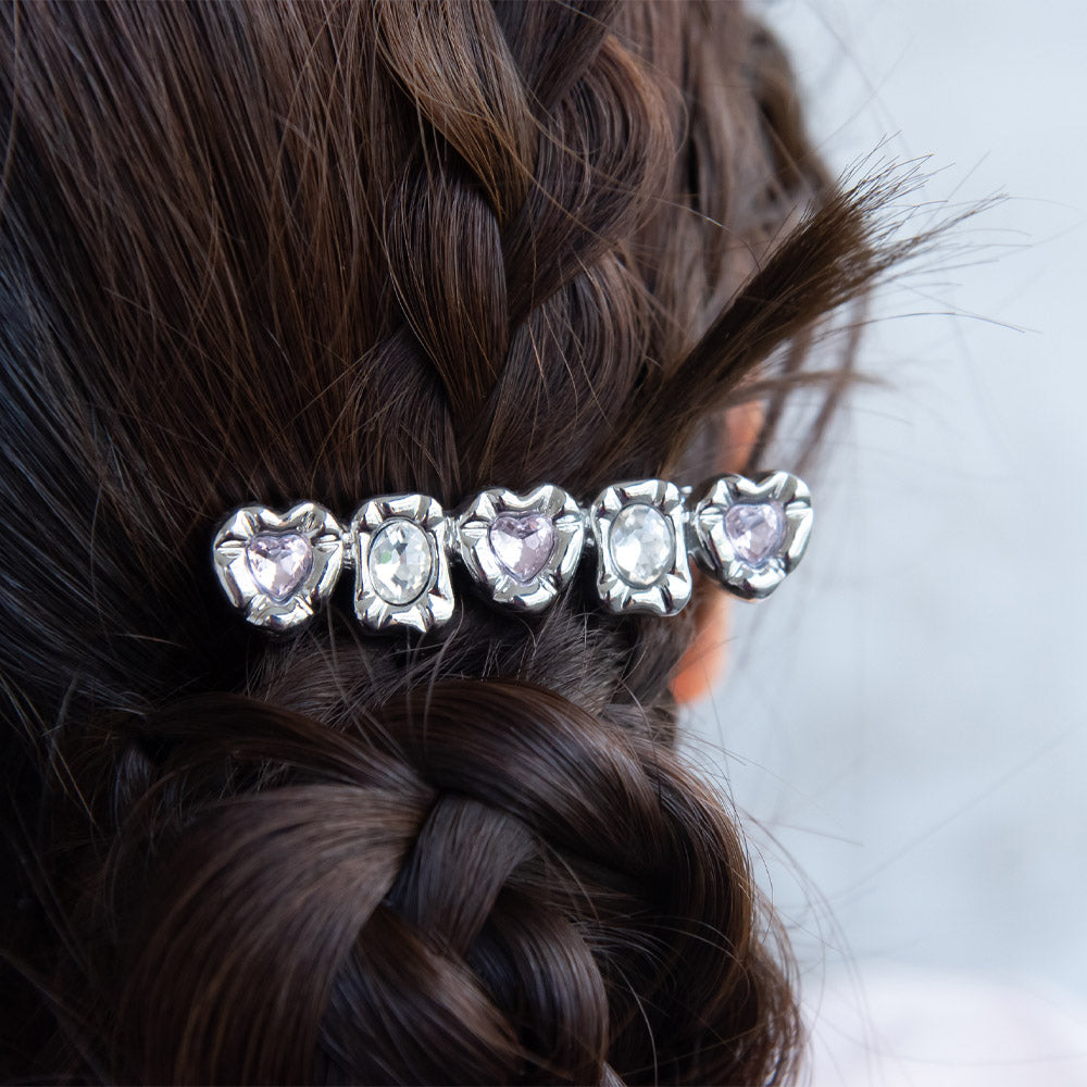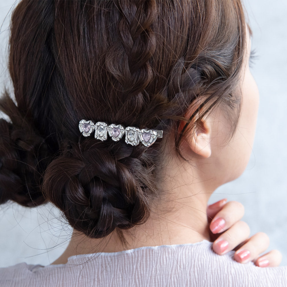 Elevate your hair game with our Heart Gemline Pinch Clip. Adorned with multiple bijoux, these hairpins showcase the perfect balance of elegance and modernity. Whether you're a K-fashion enthusiast or simply seeking a chic hair accessory for everyday wear, this hair clip adds a fresh twist to any outfit. Crafted with nickel-free materials, it's designed to be gentle on even the most sensitive skin.