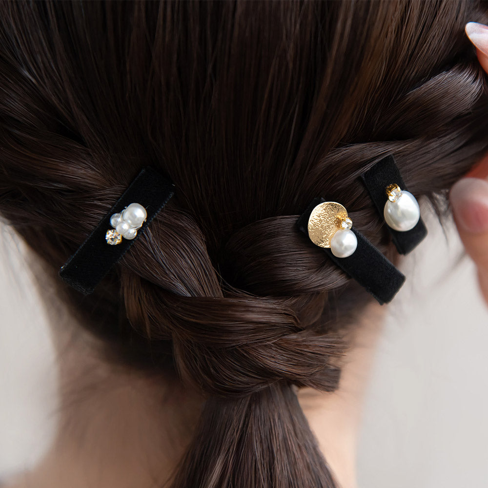 Elevate your hair game with the Velvet Ornate Hair Clip Set. Made from luxurious black velvet, each clip is adorned with stunning bijoux for a touch of elegance. An essential accessory for every feminine wardrobe.