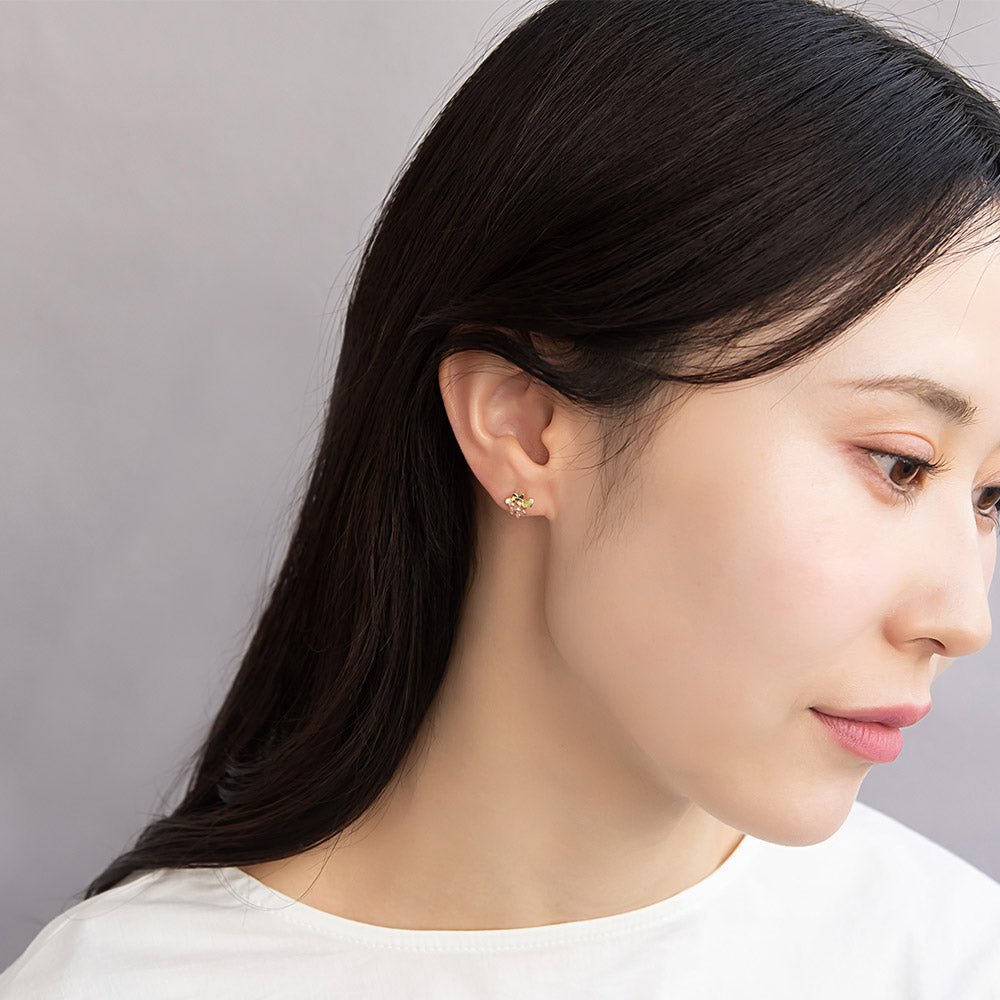 Material: brass, glass, epoxy, faux pearl, plastic earring post