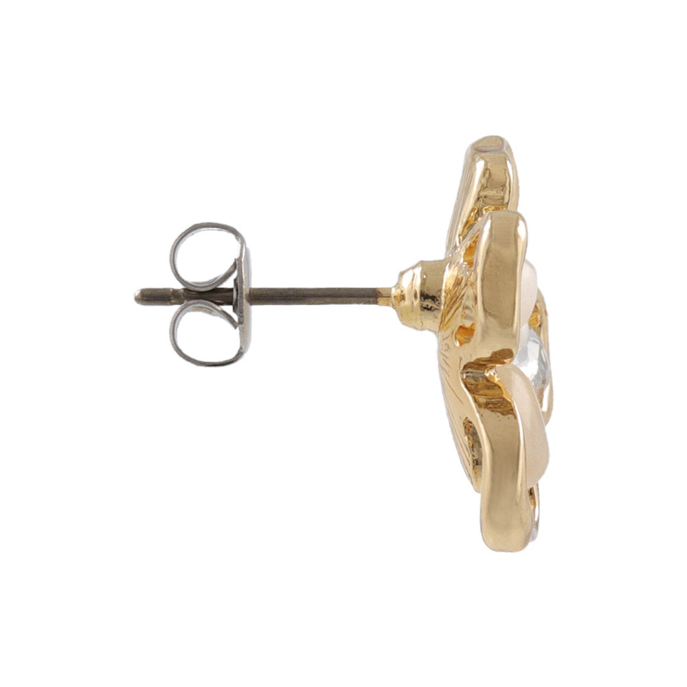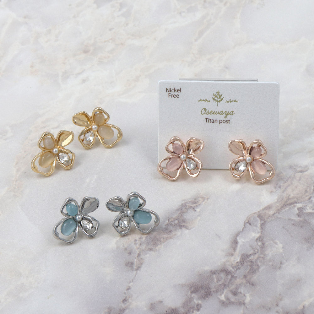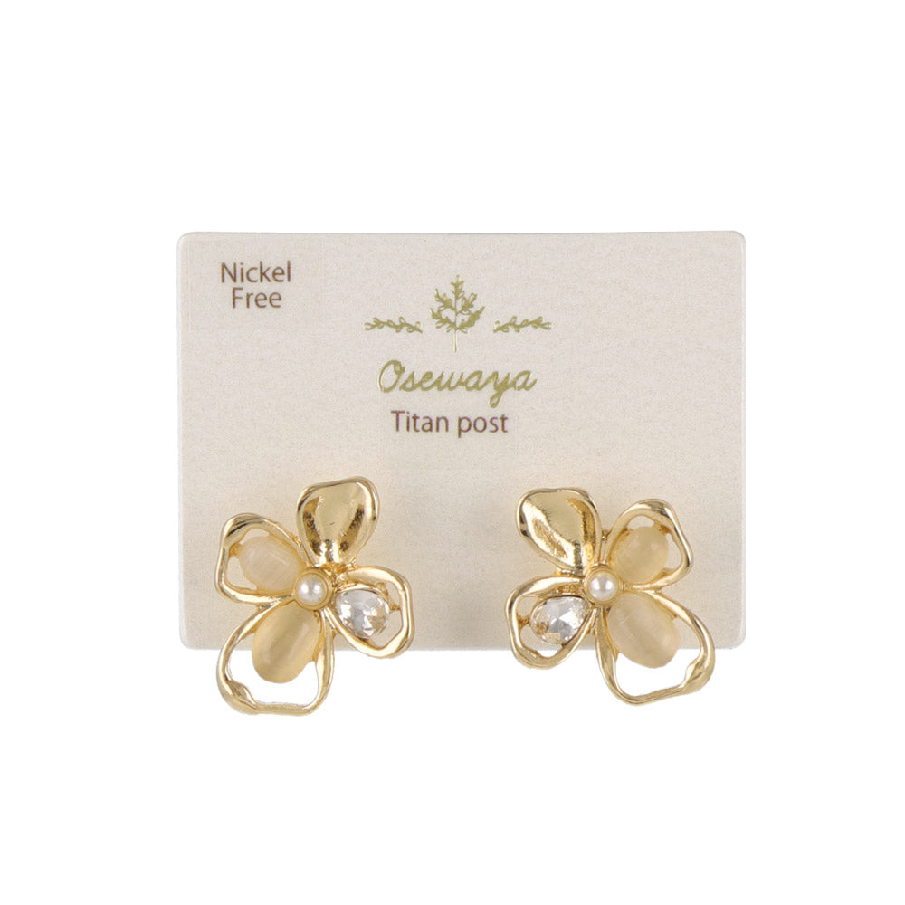 Material: brass, faux cat's eye stone, glass, faux pearl, titanium earring post
