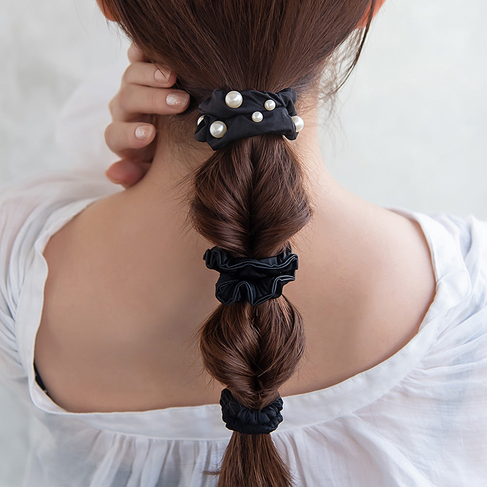 Upgrade your hair game with our Mixed Black Scrunchie Pack—a perfect blend of style and practicality. This versatile set includes three scrunchies, each with a modern and versatile design. Wear them solo for a subtle accent or mix and match to create playful combinations that complement any mood or outfit!