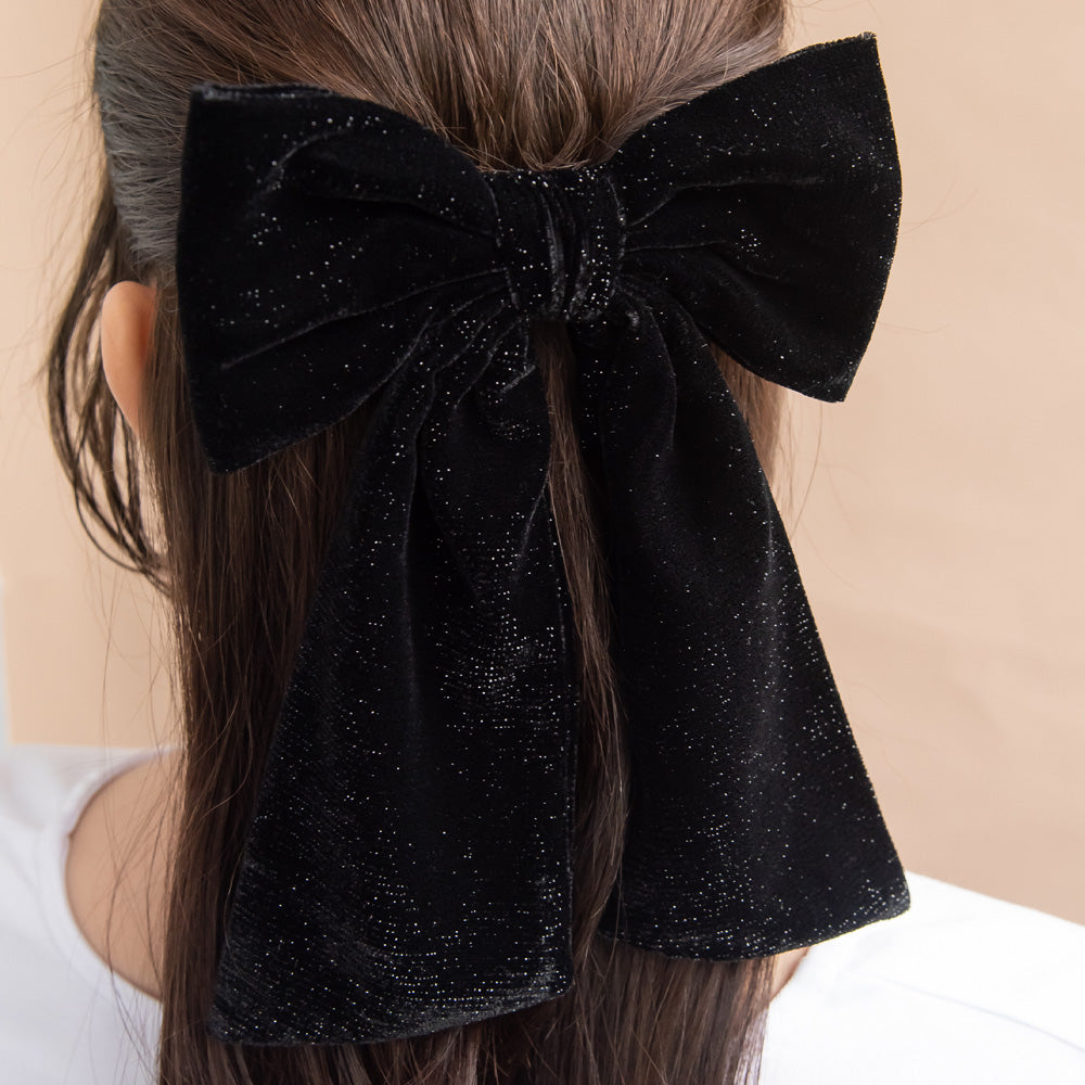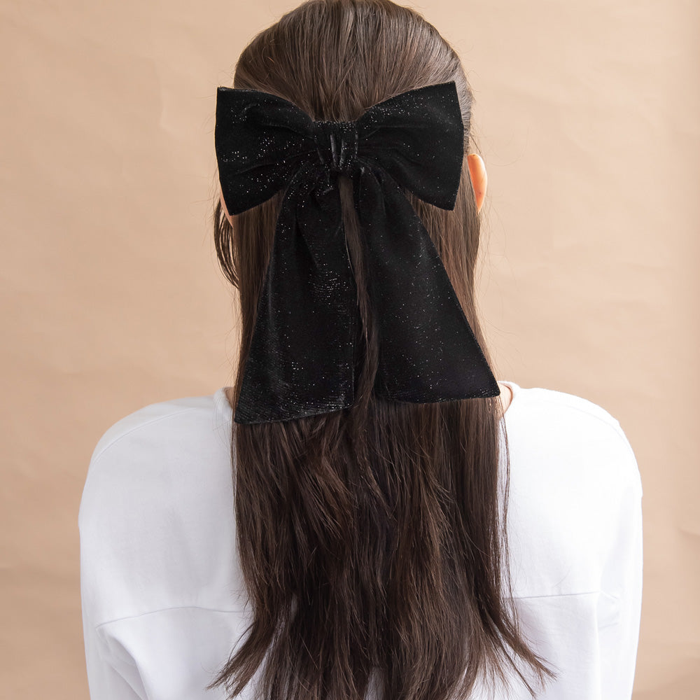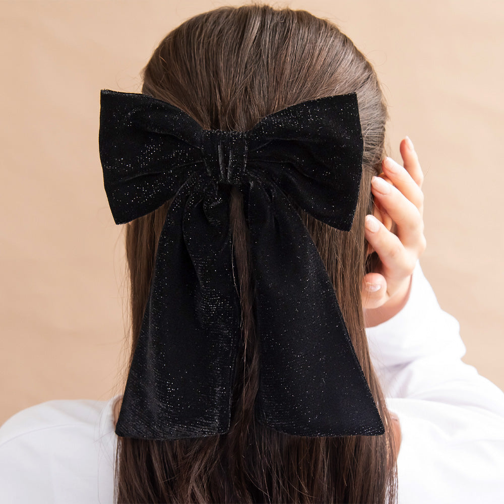 Bring a touch of seasonal glam to your look with our Glittery Black Velvet Bow Barrette. Adorned with an elegant long tail bow crafted from a soft, sparkling fabric, this statement piece adds a touch of drama and sophistication to any outfit. Perfect for office days, weekend outings, or evenings out, it provides the perfect finishing touch to help you effortlessly stand out.