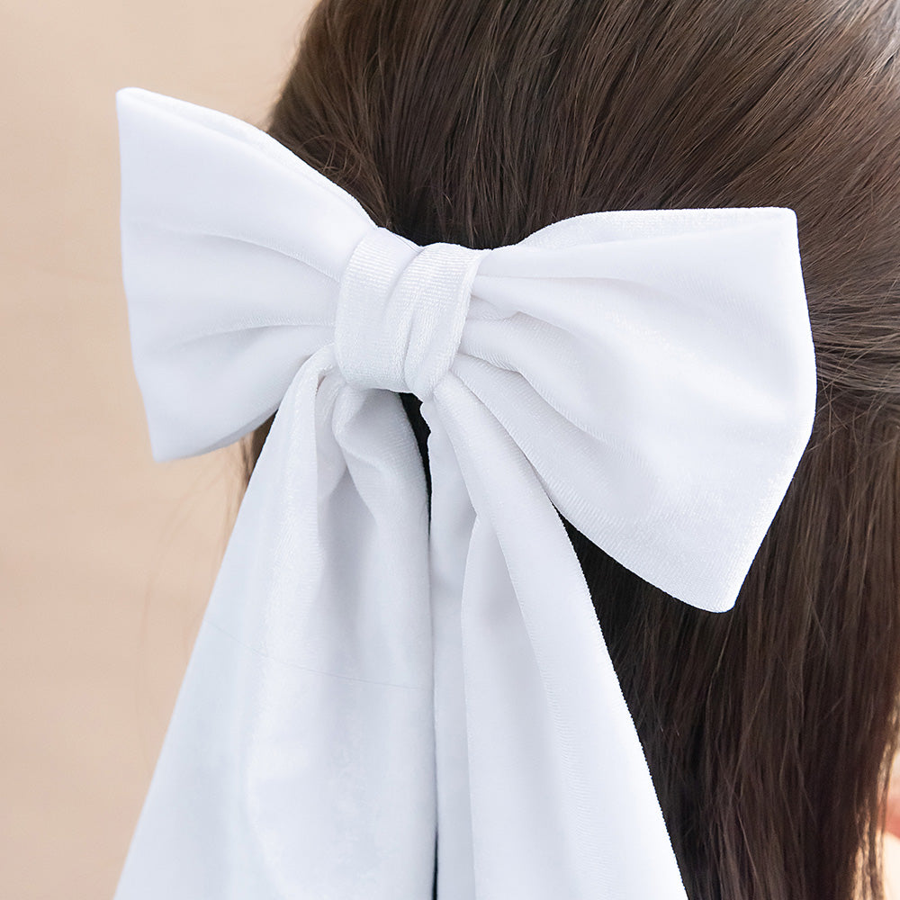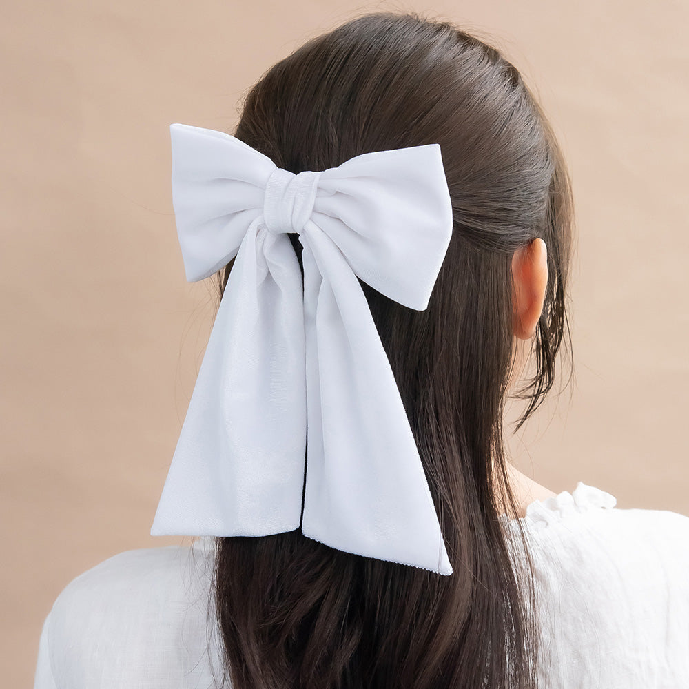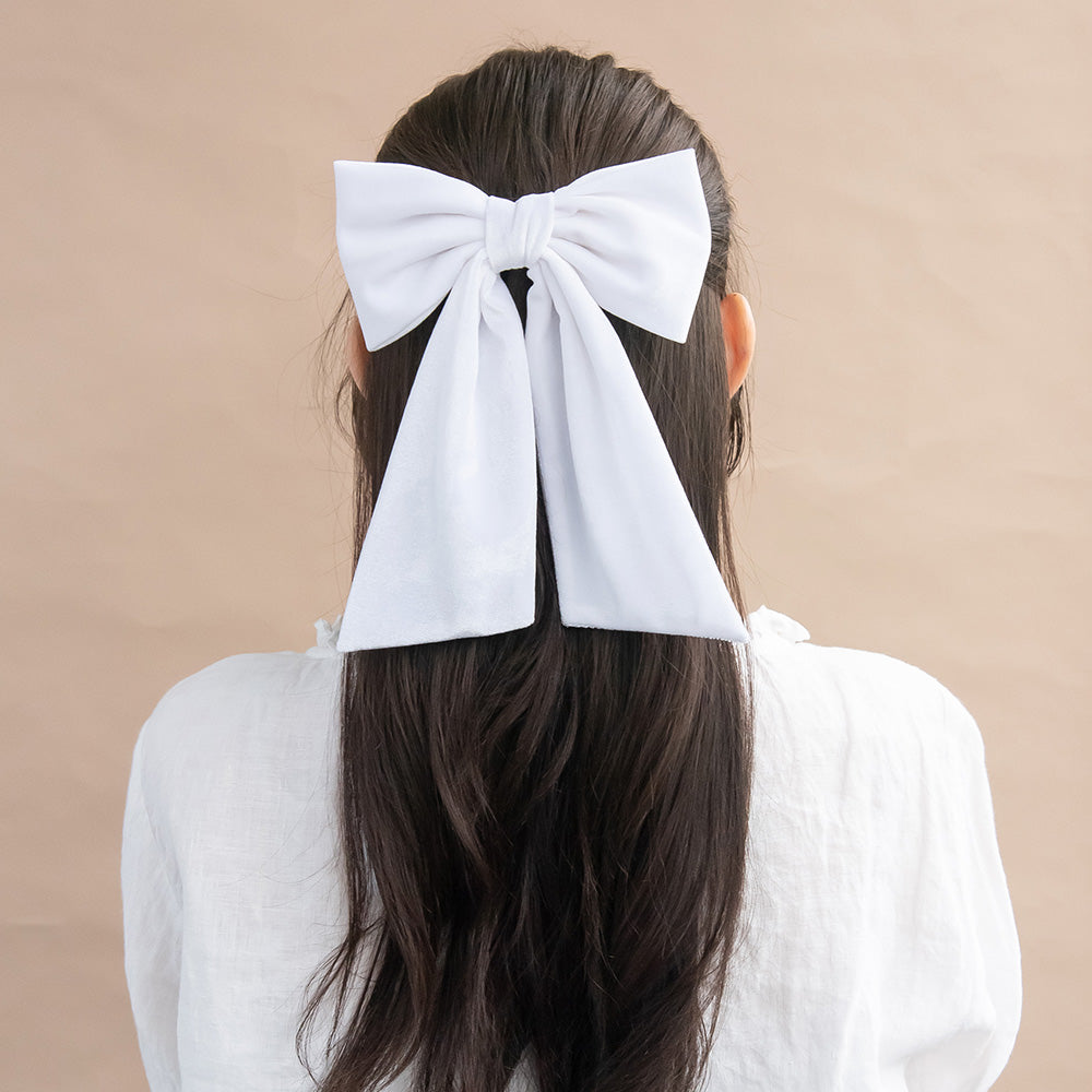 Bring a touch of seasonal charm to your look with our White Velvet Bow Barrette. Adorned with a luxuriously sleek white velvet bow, this elegant statement piece adds a touch of drama and sophistication to any outfit. Perfect for office days, weekend outings, or evenings out, it provides the perfect finishing touch to help you effortlessly stand out.
